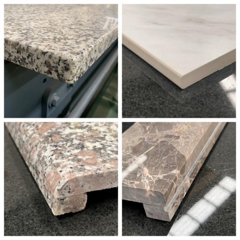 La perfiladora de cantos de piedra está diseñada para procesar diversos tipos de piedra, como mármol, granito, cuarzo y piedra sinterizada. Permite la producción continua de múltiples perfiles de canto, como medio redondeado, redondeado completo, radios y chaflanes, con alto brillo y alta eficiencia.